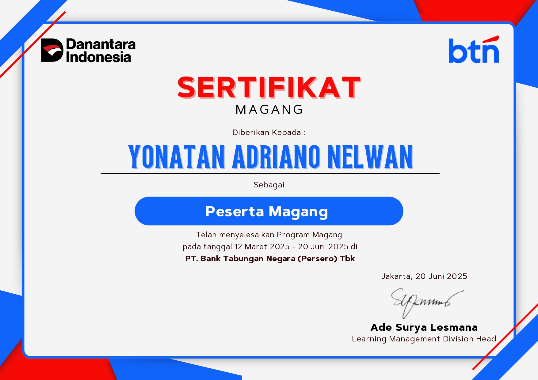 Selamat kepada Yonatan Adriano Nelwan, Mahasiswa UT Manado yang Telah Menyelesaikan Program Magang BTN 2025